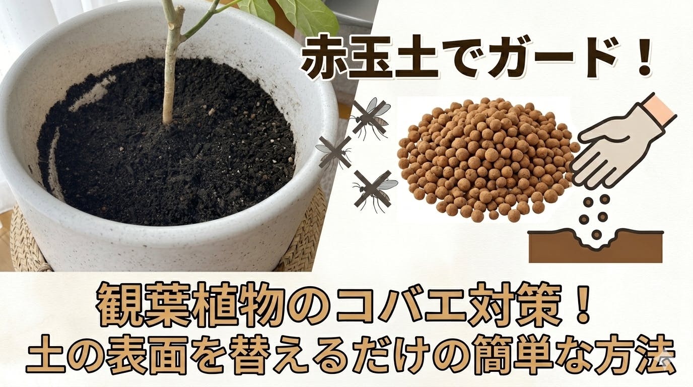 赤玉土を使った「土の表面替え」で、観葉植物に発生するコバエの産卵を防ぐ方法を実体験をもとに解説します。