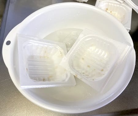 1. 納豆パックとフィルムを洗い、洗い汁を作る